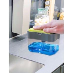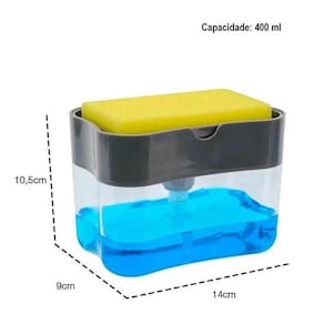 Suporte De Esponja Com Dispenser Porta Detergente Muito Mais Praticidade e Economia na Hora de Lavar à Louça Produto desenvolvido para facilitar a vida da dona de casa. Com design eficiente, possui recipiente para colocar o detergente mantendo o controle de seu gasto. Na parte superior possui bico dosador de fácil utilização, bastando apenas pressionar para a quantidade necessária sair diretamente na esponja. Vem com cavidade para guardar a esponja, facilitando a organização de sua cozinha. Feito em material de alta qualidade, resistente e seguro.