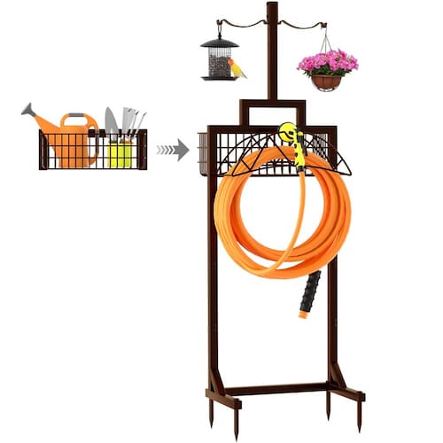 DMDG Suporte de mangueira de jardim marrom para exterior, suporte de mangueira de água com armazenamento de mangueira e armazenamento de ferramentas, suporte de mangueira externo independente removível para armazenamento com ganchos de pastores