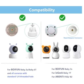 -?Compatibilidade?O suporte para monitor de bebê Derebir é compatível com BOIFUN Baby 2S/Baby 5S/Baby 6T, ARENTI P2Q/B2, ieGeek Baby 1T e DEATTI BM101-M, cabem em outras câmeras para bebês com orifício de rosca padrão de 1/4. (NOTA: verifique o modelo da câmera antes de fazer seu pedido)
