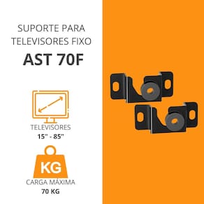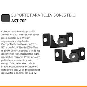 Ficha Técnica - Marca: Amvox - Modelo: AST 70F - Indicado Para: TV - Tipo: Fixo - Cor: Preto - Instalação: De Parede - Polegadas: 15" - 85" Polegadas - Carga Máxima: 85 kg - Compatível: VESA 100x100mm - VESA 600x600mm - Material: Polietileno - EAN: 7898649373066
