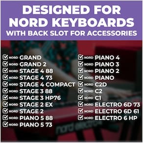 O suporte de partitura para teclado NORD é habilmente feito de alumínio durável com uma espessura de 2,5 mm e um acabamento preto elegante, garantindo estilo e força. Projetado para segurar teclados NORD com segurança, possui um ângulo ajustável de 120 graus para visualização ideal e é compatível com uma ampla variedade de modelos, incluindo NORD Grand, Stage, Electro, piano e muito mais. A estrutura de aço resistente mede 69,8 cm x 26,7 cm e inclui duas prateleiras espaçosas, oferecendo amplo espaço para partituras, tablets ou laptops. Com sua instalação sem ferramentas, este suporte é fácil de fixar e destacar, tornando-o um acessório versátil e prático para qualquer músico. - Ajuste perfeito para teclados Nord: projetado exclusivamente para teclados digitais Nord, este suporte de partitura se fixa perfeitamente para uma fixação segura e estável, melhorando sua experiência de jogo durante a prática ou desempenho. - Estrutura resistente e durável: Feito de metal durável e de alta qualidade (alumínio), este suporte oferece uma plataforma confiável para Nord Grand Stages 76/88, Electros C1/C2/C2D e piano. Feito para durar, resiste ao uso prolongado com facilidade. - Fácil instalação e ajuste: prenda e remova o suporte sem esforço sem ferramentas. Você pode ajustar o ângulo para encontrar a posição de visualização perfeita, garantindo conforto e conveniência. Tem uma estrutura de aço que mede 69,8 cm x 26,7 cm e inclui duas prateleiras. - Leve e portátil: o suporte é leve com uma espessura de 2,5 mm e o design resistente facilita o transporte e a configuração, ideal para shows, sessões de estúdio ou ensaios em movimento. Possui um ângulo ajustável de 120 graus para visualização ideal. - Design elegante e minimalista: complemente seu teclado NORD com este suporte elegante e minimalista que combina estilo com funcionalidade. Seu design compacto garante que não ocupe espaço extra enquanto oferece o máximo de utilidade.