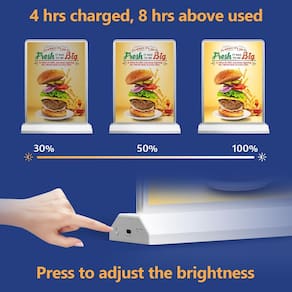 Suporte de exibição de folhetos Material acrílico durável e transparente para um suporte de exibição duradouro e visualmente atraente. O design resistente à água protege contra arranhões, manchas e rasgos, garantindo uma aparência impecável. O suporte de menu LED adota um design em forma de T com uma base traseira mais larga e mais forte que permite fácil colocação em qualquer mesa ou mesa. A peça da caixa de luz pode ser substituída de forma rápida e conveniente. Puxe a base e deslize a peça da caixa de luz para fora para substituir a peça da caixa de luz. Suporte de exibição de papel com bateria de mais de 8 horas, sem necessidade de conectar, bateria embutida de 10000mA, conexão Snap, plugue e luz, desmontagem e montagem rápidas, a conexão entre a base e a parte inferior da caixa de luz é mais segura com fivelas. Suporte transparente para exibição, a solução perfeita para exibir menus, bebidas especiais, anúncios importantes, fotos, folhetos e livretos. É pequeno, não ocupa muito espaço na área de trabalho. Fácil de usar e operar. Se você o estiver usando em restaurantes, feiras, exposições, hospitais ou em qualquer outro lugar em que queira exibir sua placa ou anúncio, nosso expositor de papel em forma de T é a escolha ideal.