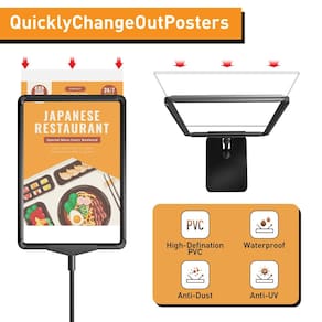 Construção durável: Feito com uma combinação de uma moldura de suporte de pôster de plástico, poste de metal de 2 peças, fixador rotativo de plástico e placa inferior de metal, garantindo longevidade e estabilidade.