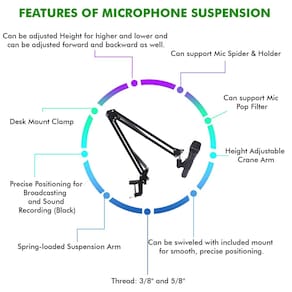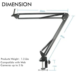 — Design de mesa conveniente: o suporte da lança do microfone é feito de liga metálica de aço de alta qualidade e tem suporte triplo para suporte e estabilidade excepcionais. A braçadeira de montagem universal é fixada em mesas, mesas, prateleiras, balcões e etc.