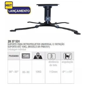 MarcaMXT ModeloAR-PMA101 CorPreto Descrição Suporte de teto universal para projetor , 112mm Composiçao : aco,abs,aluminio Cor: preto Peso maximo: 10kg Giro 360 Inclinacao: 15