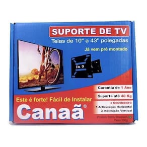Suporte De Tv Articulado Até 40Kg Monitor/Plasma/Lcd/Led Suporte Articulado Qs-40 Canaã- Acompanha parafusos e buchas para instalação. Tipos de telas suportadas: led/lcd/plasma Tamanho mínimo da tela - Tamanho máximo da tela: 10 - 43 Lugar de montagem: Parede É inclinável: Sim É articulado: Sim É fixo: Sim Descrição SUPORTE DE TV ARTICULADO Características do Produto: Suporte para TV e Monitores LCD Plasma e LED. Capacidade: 10 A 43 Polegadas. O suporte efetua 2 movimentos. Sendo: 1 Articulação Horizontal 2 Inclinação Vertical. - material metal super resistente com parafusos e buchas Medidas aproximadas do produto - Comprimento: 18 cm - Altura: 8 cm - Largura: 15 cm - Peso: 500 g