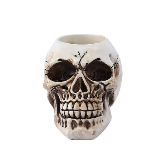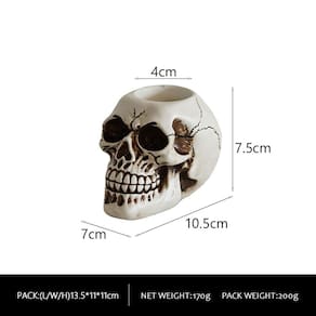 Material: Resina Tamanho: 7x10,5 x 7,5 cm Peso: 170 g Design realista de vela de caveira — Esta escultura apresenta um crânio humano altamente detalhado com características esculpidas e uma cavidade de vela, perfeita para ambientes assustadores. Decoração compacta e versátil — Medindo 10,5 x 7 x 7,5 cm, serve como enfeite de mesa ou base de vela para festas de Halloween, cenas assombradas ou eventos temáticos. Construção durável em resina — Feita com resina de qualidade com efeitos de envelhecimento pintados à mão e rachaduras texturizadas para uma aparência realista. Ideal para salas de roteiro e ambientes temáticos — melhora a atmosfera em salas de escape, jogos de mesa ou salas temáticas de terror com caráter gótico. Estilo de ornamento de arte escura — combina design funcional com arte escultural misteriosa, tornando-o uma adição excepcional a configurações de decoração de terror, gótica ou alternativa.