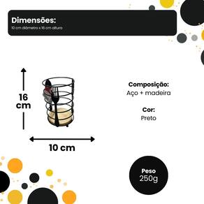 Especificações: Dimensões: 10 cm diâmetro x 16 cm altura Composição: Aço + madeira Cor: Preta com base madeira natural Peso: 250 g