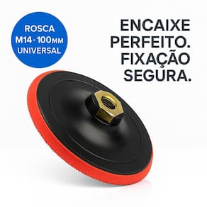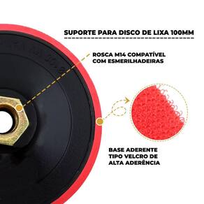 Vantagens: - rosca m14 compatível com maioria das esmerilhadeiras - base com pluma aderente - troca rápida do disco - diâmetro de 100mm 4 - alta resistência para uso contínuo e profissional - melhora o rendimento e evita danos no lixamento - suporte firme, sem vibração ou soltura