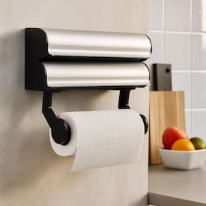 Esse acessório inteligente permite armazenar rolos de papel alumínio, filme plástico e papel toalha, proporcionando cortes precisos com suas lâminas integradas e acesso facilitado no dia a dia. Ideal para quem valoriza eficiência e elegância na rotina.