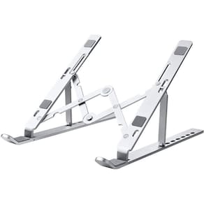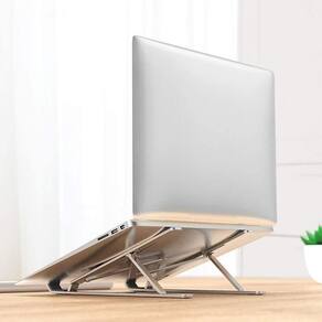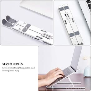 Suporte dobrável ajustável para laptop para tablet e notebook A1119 - EX-1019 Características: cor: prata - Material: liga de alumínio, silicone - Tamanho: 25,30 x 4,50 x 1,50 cm/9,94 x 1,77 x 0,59 polegadas - Materiais de alta qualidade, seguros e ecológicos. - Processo de oxidação de polimento CNC de estampagem de liga de alumínio, forte e resistente ao desgaste. - Sete níveis de altura ajustável, carga de cerca de 40 kg - É adequado para laptops com menos de 15,6 polegadas.