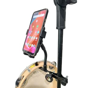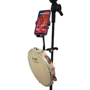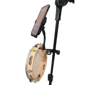 Suporte duplo de celular e pandeiro, todo fabricado em metal de alta resistência, pintura epóxi e de simples instalação desenvolvido por JC suportes para ser acoplado em pedestais de microfone padrão, compacto medindo somente 27x10x10 cm e pesando 257g na cor preto brilho, sendo transportado facilmente, Vai facilitar muito nos seus shows, festas, lives, palestras etc, e conta também com um suporte para o seu celular que tem uma haste flexível de fácil manipulação, acompanha manual de instruções e mini bag.