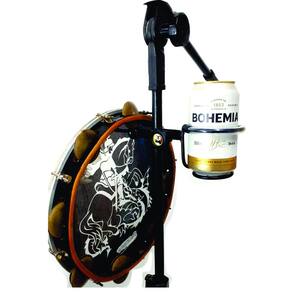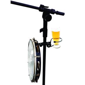 Suporte duplo de pandeiro e copo, todo fabricado em metal de alta resistência, pintura epóxi e de simples instalação desenvolvido por JC suportes para ser acoplado em pedestais de microfone padrão, compacto medindo somente 26x9x7 cm e pesando 220g na cor preta, sendo transportado facilmente, contém um recipiente para colocar seu copo, garrafinha de água, taça de bebidas etc. Vai facilitar muito nos seus shows, festas e rodas de samba.