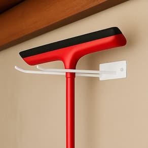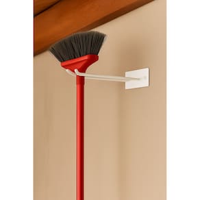 Suporte de parede com estrutura em ferro, desenvolvido para acomodar itens como vassouras, rodos e utensílios semelhantes. Pode ser instalado em diferentes ambientes, contribuindo para a organização do espaço.