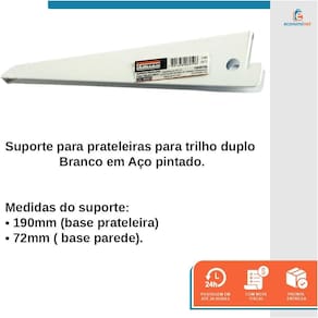 Suporte Trilho Duplo Branco 17cm - STARFERSuporte para prateleiras para trilho duplo branco em aço pintado.Medidas do suporte: 190mm (base prateleira) x 72mm ( base parede). Indicado para fixar prateleiras com largura até 170mm.Embalagem: caixa de papelão.Ref.: 13040702Marca: Starfer