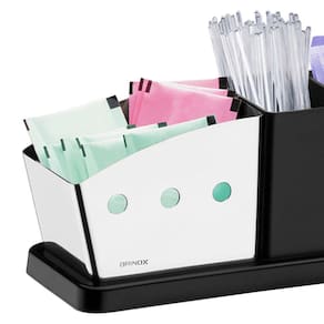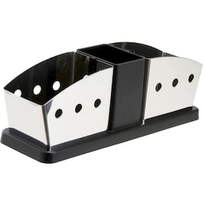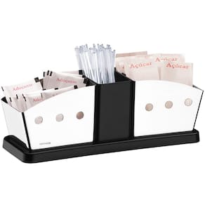Suporte em Aço Porta Sachês Açúcar Adoçante Porta Colherinha #Suporte para Sachês e Colherinhas #Resistente e Fácil de Limpar #Moderno e Diferenciado Garantia: 90 dias / Peso: 180g / Cor: Inox e Preto / Ref: 1577100 Dimensões: 9,4cm (C) x 5,8cm (L) x 4cm (A) Cuidados: Não lavar com materiais abrasivos; Se preciso lave-o com esponja macia e sabão ou detergente neutro; Recomenda-se o uso de água quente para um melhor resultado de brilho e limpeza. Enxágue bem e seque em seguida. Comporta: Sachês de açúcar, chá e adoçantes e colherinhas. Material: - Aço Inox: Material altamente resistente à ferrugem, altamente durável, resistente e fácil de limpar. - ABS: Termoplástico desenvolvido para aplicações que necessitem de uma boa resistência ao impacto e um bom aspecto visual. Ideal para o cantinho do café, este porta sachês com 3 compartimentos irá facilitar o seu dia a dia mantendo a organização. Com espaço para seus sachês de açucares, adoçante e também as colherinhas para mexer as bebidas, ele é compacto, prático e com design que se encaixa a qualquer ambiente, irá trazer organização e elegância na sua residência ou ambiente comercial.