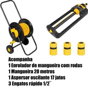 Kit composto de 1 enrolador de mangueira com rodas Vonder + 20m Mangueira para jardim, superflexível, 1/2" + 3 Engates rápido 1/2¨ passagem livre Vonder + 1 Aspersor oscilante 17 jatos Vonder