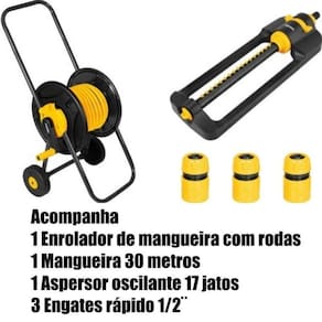 Kit composto de 1 enrolador de mangueira com rodas Vonder + 30m Mangueira para jardim, superflexível, 1/2 + 3 Engates rápido 1/2 passagem livre Vonder + 1 Aspersor oscilante 17 jatos Vonder - Enrolador de mangueira com rodas Vonder Conteúdo da Embalagem: 1 Suporte para mangueira, acompanha: 2 conectores 1/2 fêmea , 1 conector principal macho + 3 engates rápido 1/2 Possui corpo em plástico ABS, manivela para acionamento, base e alça metálicas tubulares para transporte/apoio. Acompanha conectores macho para engate rápido 1/2. Fácil montagem, não necessita de ferramentas. Indicado para enrolamento de até 45 m de mangueira de jardim 1/2 . Garantia legal: 90 dias DETALHES TÉCNICOS Capacidade do suporte enrolador para mangueira: Mangueiras de 1/2: 45 metros / Mangueiras de 5/8: 30 metros Cor do suporte enrolador para mangueira: Amarelo e preto Material do suporte enrolador para mangueira: Base em plástico ABS / Alça metálica Massa aproximada peso : 1.91 kg - Mangueira para jardim, superflexível, 1/2 Vonder Conteúdo da Embalagem: 1 Rolo de mangueira 30 m. Possui PVC resistente aos raios ultravioleta. Indicada para condução de água fria em limpeza e irrigação em jardim. NÃO é trançada. Garantia legal: 90 dias + Garantia contratual: 3 meses - Aspersor oscilante 17 jatos Vonder Conteúdo da Embalagem: 1 Aspersor. Possui 17 jatos de água e sistema oscilante ajustável em até 180, proporcionando ampla eficiência e alcance na irrigação.Indicado para irrigações em geral. Vazão aproximada: 1.200 litros/h. Garantia legal: 90 dias DETALHES TÉCNICOS Cor: Amarelo e preto Material: Plástico Diâmetro da mangueira: Engate rápido de 1/2 Massa aproximada peso : 0,262 kg
