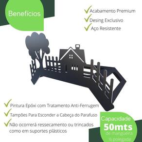 O Suporte de Mangueira Home Preto é a solução ideal para evitar esses problemas e dar um toque especial na decoração em seu jardim. Produzido em aço com proteção anti-ferrugem de fosfatização e com um lindo acabamento de pintura eletrostática epóxi, garante que mesmo exposto a sol e chuva, não ocorrerá ressecamento ou trincados como ocorrem nos suportes de plásticos. Sua instalação é fácil pois já acompanham parafusos e buchas.