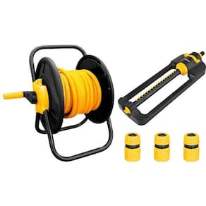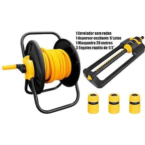 Kit composto de 1 enrolador de mangueira sem rodas Vonder + 20m Mangueira para jardim, superflexível, 1/2 + 3 Engates rápido 1/2 passagem livre Vonder + 1 Aspersor oscilante 17 jatos Vonder - Enrolador de mangueira sem rodas Vonder Conteúdo da Embalagem: 1 Suporte para mangueira, acompanha: 2 conectores 1/2 fêmea , 1 conector principal macho . Possui corpo em plástico ABS, com manivela para acionamento, base e alça metálicas tubulares para transporte/apoio. Acompanha conectores macho para engate rápido 1/2. Fácil montagem, não necessita de ferramentas. Indicado para enrolamento de até 30 m de mangueira de jardim 1/2 não acompanha mangueira . legal: 90 dias DETALHES TÉCNICOS Capacidade do suporte enrolador para mangueira:Até 30 m Cor do suporte enrolador para mangueira:Amarelo e preto Material do suporte enrolador para mangueira:Plástico ABS Massa aproximada peso :1,67 kg - Mangueira para jardim, superflexível, 1/2 Vonder Conteúdo da Embalagem: 1 Rolo de mangueira 20 m. Possui PVC resistente aos raios ultravioleta. Indicada para condução de água fria em limpeza e irrigação em jardim. NÃO é trançada. legal: 90 dias + contratual: 3 meses - Aspersor oscilante 17 jatos Vonder Conteúdo da Embalagem: 1 Aspersor. Possui 17 jatos de água e sistema oscilante ajustável em até 180, proporcionando ampla eficiência e alcance na irrigação.Indicado para irrigações em geral. Vazão aproximada: 1.200 litros/h. legal: 90 dias DETALHES TÉCNICOS Cor: Amarelo e preto Material: Plástico Diâmetro da mangueira: Engate rápido de 1/2 Massa aproximada peso : 0,262 kg Marca: Não Informado
