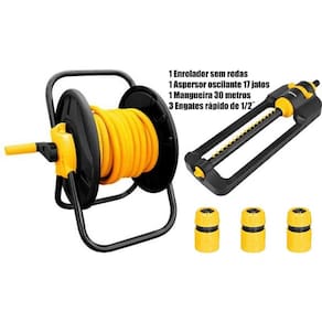 Kit composto de 1 enrolador de mangueira sem rodas Vonder + 30m Mangueira para jardim, superflexível, 1/2" + 3 Engates rápido 1/2¨ passagem livre Vonder + 1 Aspersor oscilante 17 jatos Vonder