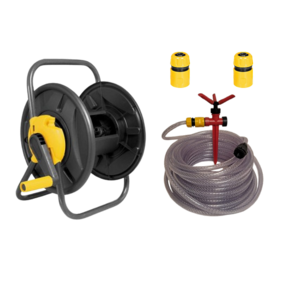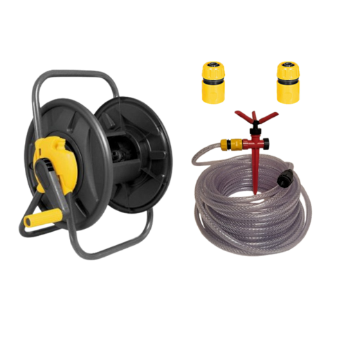 Kit composto de 1 enrolador de mangueira sem rodas Vonder + 1 Mangueira para jardim, trançada, transparente, 20 m, Vonder + 3 Engates rápidos 1/2¨ passagem livre Vonder + 1 Irrigador Giratório NOVE54
