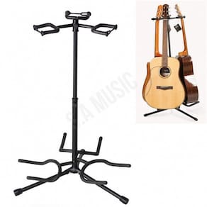Características: Suporte conjugado para Violão, Guitarra, Contra Baixo, Cavaco, entre outros instrumentos de Cordas; Cada suporte possui uma leve elevação superior ( atuando como Trava ), deste modo evitando que o instrumento deslize do suporte; A base superior ( apoio do Headstock ) e inferior ( apoio de trás dos instrumentos ) são articuláveis, facilitando montar / desmontar; Base revestida com material acolchoado e aveludado ( tipo E.V.A ) ( Headstock dos instrumentos ); Apoio ( partes de trás dos instrumentos ) revestido com material acolchoado e aveludado ( tipo E.V.A ); Tubos em metalon com pintura eletrostática na cor Preto; Tripé emborrachado, proporcionando maior aderência e/ou evitar riscar ou danificar o piso; Excelente estabilidade e durabilidade; Disponível na cor Preto.