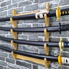 Com design compacto, acomoda até 4 espadas de diferentes tamanhos, garantindo fácil acesso e organização. Além disso, conta com um gancho para pendurar, facilitando a instalação e otimizando o espaço.