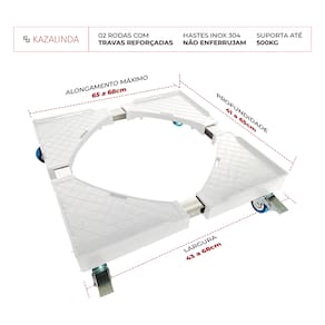 - Movimentação sem esforço: Projetado para facilitar a locomoção de objetos pesados, tornando a limpeza e organização do ambiente mais fácil. - Tamanho ajustável: Adapta-se perfeitamente a diversos eletrodomésticos com sua largura ajustável de 43 a 68 cm e profundidade de 41 a 65 cm. O alongamento máximo é de 65 x 68 cm. - Alta capacidade: Suporta até 500 kg, garantindo segurança e estabilidade. - Segurança reforçada: Acompanha duas rodinhas com trava, proporcionando maior segurança e estabilidade durante o uso e no posicionamento do aparelho. - Design Discreto: Com altura de 11 cm e cor branca, integra-se harmoniosamente ao ambiente sem comprometer a estética.