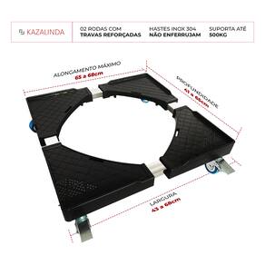- Movimentação sem esforço: Projetado para facilitar a locomoção de objetos pesados, tornando a limpeza e organização do ambiente mais fácil. - Tamanho ajustável: Adapta-se perfeitamente a diversos eletrodomésticos com sua largura ajustável de 43 a 68 cm e profundidade de 41 a 65 cm. O alongamento máximo é de 65 x 68 cm. - Alta capacidade: Suporta até 500 kg, garantindo segurança e estabilidade. - Segurança reforçada: Acompanha duas rodinhas com trava, proporcionando maior segurança e estabilidade durante o uso e no posicionamento do aparelho. - Design Discreto: Com altura de 11 cm e cor preta, integra-se harmoniosamente ao ambiente sem comprometer a estética.