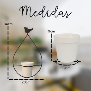 - O vaso branco acompanha o suporte e possui design minimalista que combina facilmente com qualquer paleta de cores.
