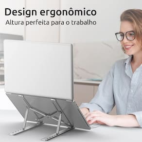 CARACTERÍSTICAS Ergonômia: Altura ajustável em 6 níveis para manter o notebook em uma posição confortável. Estabilidade: Design avançado que permite que o notebook fique em qualquer superfície. Fácil de transportar: Tamanho compacto, adequado para ter em casa, escritório ou qualquer outro lugar. Acompanha capa de veludo para não arranhar o notebook durante o transporte.