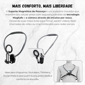 Suporte magnético alça de pescoço para celular smartphone Cor: preto O suporte magnético de pescoço magsafe é o acessório inovador que todo criador de conteúdo precisa. Produzido em pc/abs, liga de zinco e silicone macio, o suporte é leve, resistente e ergonômico, projetado para longas horas de uso sem machucar o pescoço. Sua tecnologia magnética magsafe mantém o smartphone firme e seguro, e a base com rosca universal 1/4 permite conectar câmeras compactas ou acessórios. Especificações: Dimensões do suporte: 30 22 4,2 cm Peso: 386 g Material: pc/abs + liga de zinco + silicone Compatibilidade: com magsafe, celulares com anel magnético incluso, câmeras/acessórios com rosca 1/4 Conteúdo 1x suporte magnético de pescoço 1x corda anti-perda 1x parafuso 1x suporte magnético 1x folha magnético 1x anel magnético 1x alça fixa de tecido adesivo ponta dupla 1x manual de instruções Anúncio referente a suporte magnético de pescoço Acessórios que ambientam as fotos não inclusos. Marca: Não Informado Ean: 7793596667605