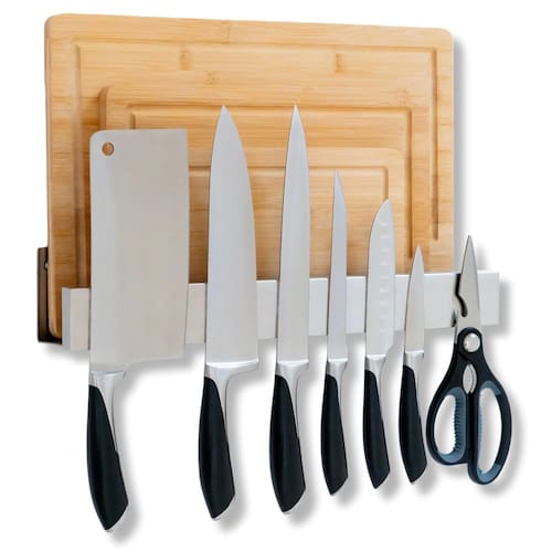 - Atualize sua cozinha com nossa tira magnética de faca de cozinha 2 em 1 e suporte de tábua de cortar! Ao contrário de um ímã de faca tradicional, nosso design economiza mais espaço valioso enquanto mantém suas ferramentas à mão, oferecendo a solução mais inteligente que você merece!