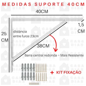 Suporte Mão Francesa Prateleira 15, 20, 25, 30, 35, 40, 50cm Cantoneira Reforçada Kit Com 2 Unidades Escolha o SeuSuporte com design tradicional e discreto ideal para qualquer tipo de ambiente e prateleira. Possui furos para fixação na parede e no objeto que se irá apoiar.QUALIDADE, RESISTÊNCIA E DURABILIDADESua pintura é eletrostática na cor branca o que garante qualidade e durabilidade além de ser um produto feito em aço, o que garante resistência e força suportando até 20kg.MULTIUSO E VERSÁTILPode ser usada para organizar vários tipos de objetos e utensílios, livros, porta retratos e permite combinação com outras prateleiras facilitando a organização, como por exemplo:*Cozinha e lavanderia > Você pode usar diversas prateleiras para formar uma dispensa na cozinha, ou guardar produtos de limpeza na lavanderia.*Quarto infantil > Você usa para organizar brinquedos infantis no quarto, ou mesmo produtos de uso diário (lenços umedecidos, fraldas, etc).*Quarto e Sala > Use para organizar livros, estatuetas, etc.O produto já vai pronto para instalar e enviamos o kit completo de fixação que inclui duas buchas e quatro parafusos por suporte, sendo dois maiores para a parede, e dois menores para a madeira não deslizar e ficar bem firme.CARACTERÍSTICAS:- Suporte na cor Branca- Pintura eletrostática >> não enferruja- Produzido em aço >> mais durabilidade- Barra diagonal soldada >> mais resistente- Mão Francesa ( REFORÇADA/PESADA )CONTEUDO DA EMBALAGEM- 2 X Mãos francesas 15cm ou 20cm ou 25cm ou 30cm ou 35cm ou 40cm ou 50cm- 4 X Parafusos 5,0 x 40mm- 4 X Parafusos 3,5 x 14mm- 4 X Buchas 8mm