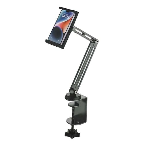 No que se refere ao ajuste e versatilidade, o suporte possui múltiplos eixos de articulação e uma cabeça rotativa em 360 graus na extremidade. Isso permite que o smartphone seja posicionado tanto na vertical quanto na horizontal, com inclinações precisas para evitar reflexos de luz na tela sob qualquer condição de iluminação. A engenharia do braço articulado foi planeada para oferecer um alcance extenso, permitindo aproximar ou afastar o dispositivo com um simples movimento manual. As garras de fixação do aparelho são extensíveis e contam com revestimento em material macio, assegurando que o smartphone permaneça firme e protegido contra riscos ou quedas acidentais, mesmo em ângulos de visão mais ousados.