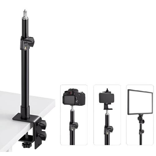 Monte uma Iluminador ou Câmera na sua estação de trabalho com este Suporte de Mesa Universal SR-Z70 com Braçadeira para Câmeras, Iluminadores e Acessórios de Estúdio. Com este Suporte de Mesa Extensível você pode montar na Mesa de seu Escritório ou Estúdio com espessura de até 8cm com a Braçadeira Clamp de alta resistência e qualidade. Feito da liga de alumínio resistente e leve, fornece a estabilidade máxima, manterá o equilíbrio perfeitamente entre o suporte e a mesa.O Suporte de Mesa Telescópico para Estúdio possui altura ajustável, que pode ser expandida de 40cm até 70cm para fácil transporte e armazenamento. E sua extremidade possui montagem padrão de 1/4 e 5/8, perfeito para montar Câmeras Fotográficas, Filmadoras Handycam, Câmeras PTZ, Iluminadores, Ring-Light, Cabeças Ball Head, SmartPhones e Tablets necessário Suporte de Celular vendido separadamente ou qualquer outro acessórios que deseja usar em sua Estúdio.Principais Características: Suporte de Mesa Universal Possui Altura Máxima 70cm e Mínima 40cm Braçadeira Clamp com abertura de 8cm Montagem padrão de 1/4 e 5/8 Feito da liga de alumínio resistente e leve Fácil de instalar, economize espaço na sua mesaCompatível com Câmeras, Filmadoras Handycam, Câmeras PTZ, Iluminadores, Ring-Light, Cabeças Ball Head, SmartPhones e Tablets necessário Suporte de Celular vendido separadamente ou qualquer outro acessórios que deseja usar em sua Estúdio de Fotografia e Filmagem. Fotos meramente ilustrativas.