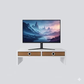 Este é um suporte de monitor elegante e funcional, projetado para elevar seu monitor a uma altura mais ergonômica, ajudando a reduzir a tensão no pescoço e nos olhos. Ele apresenta um design minimalista com uma superfície branca lisa e duas gavetas de armazenamento em madeira com puxadores circulares metálicos, perfeitas para guardar pequenos itens de escritório, como canetas, blocos de notas ou cabos.