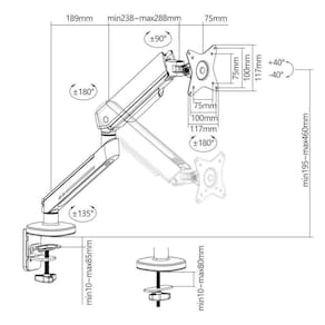 Padrão vesa mm : 75x75; 100x100 Com pistão a gás: sim Tamanho da tela: de 17 a 34 Peso suportado: de 2,5 à 9kg Local de instalação: mesa