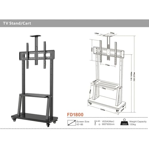 – Modelo: AVA1500-601P – Tipo de suporte: Móvel com rodas para Monitores e TVs – Capacidade: Monitores/TV de 32" à 75" – Capacidade em peso: até 46 Kg – Material: Aço Carbono – Cor: Preta – Altura: ajustável