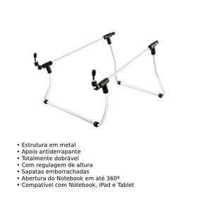 Estrutura em metal Apoio antiderrapante Totalmente dobrável Com regulagem de altura Sapatas emborrachadas Abertura do Notebook em até 360 Compatível com Notebook e Tablet Vídeo (n)::