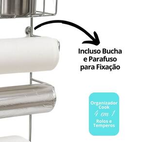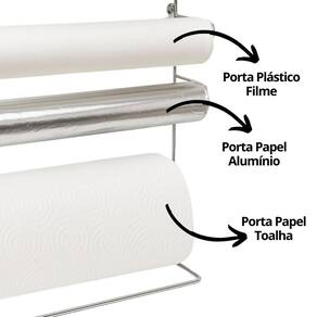 Com design funcional e estrutura resistente, o suporte comporta três tipos de rolos (papel toalha, papel alumínio e plástico filme PVC) e ainda conta com uma prateleira superior para armazenar potes de temperos e condimentos com praticidade. A instalação é simples e o produto acompanha parafusos e buchas para fixação na parede, garantindo firmeza e segurança.