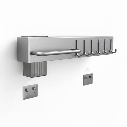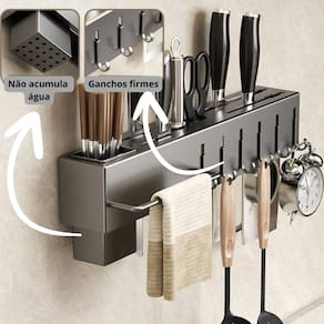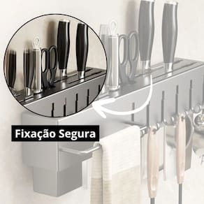 Com 6 ganchos resistentes para pendurar acessórios diversos, o produto promove uma organização inteligente, mantendo os itens ao alcance das mãos durante o preparo de receitas. Suas dimensões compactas (39,5 cm x 5,3 cm x 6,8 cm) permitem a fixação em cozinhas de diferentes tamanhos, utilizando o kit de instalação que acompanha o produto.