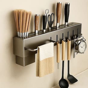 Suporte Organizador Cozinha Parede Aço Inox 6 Ganchos Porta Facas Utensílios Cinza Estrutura em aço inox para resistência à corrosão e durabilidade. Sistema com 6 ganchos móveis para pendurar conchas, escumadeiras e acessórios. Compartimentos integrados para armazenamento vertical de facas, talheres e tesouras. Barra lateral para suporte de toalhas e panos de prato para higiene e fácil acesso. Instalação por sistema de encaixe na parede com buchas e parafusos inclusos.