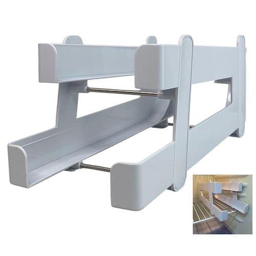 O organizador comporta até 8 latas padrao (350ml), proporcionando um armazenamento adequado para quem quer reduzir a desordem na geladeira. Conforme você retira as latas do andar inferior, as que estão no andar superior rolam para baixo.