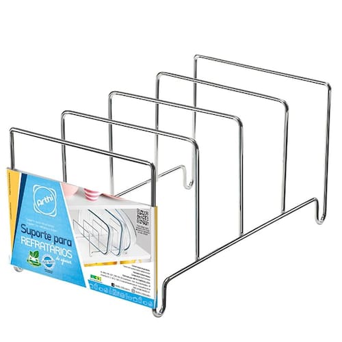 Organizador muito prático e versátil Serve para organizar: Tampas de panelas, formas, pratos, bandejas, etc. Dimensões: 16cm de largura 28cm de comprimento 14cm de altura Espaço entre as divisórias 6,5cm Material: Aço Cromado Imagens meramente ilustrativas, não incluso travessas e frigideiras Ean: 7897807418533