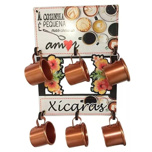 Suporte organizador vazado com 6 canecas de café em alumínio - cobre Suporte organizador vazado em madeira com 6 canecas de café em alumínio esmaltadas décor