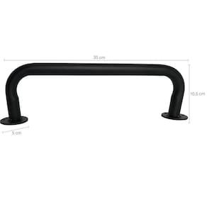 Garantia: 90 dias / Peso: 330g / Cor predominante: preto / Referência: 7899940405623 Dimensões: 35cm (C) x 5cm (L) x 10,5cm (A); Distância dos parafusos para fixação: 28cm; Conteúdo: 1 suporte para cabides curvado; Materiais: aço carbono pintado.