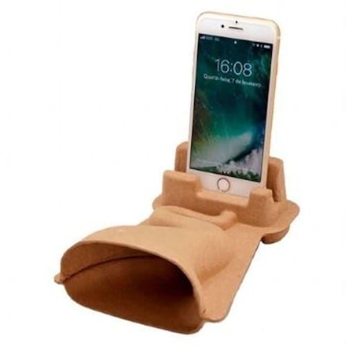 Suporte Acústico para Celular e Tablet. Amplificador de Som feito em papelão. O produto, ecologicamente correto, aceita diferentes dispositivos móveis: Smartphones e Tablete de diferentes marcas e modelos. Para utilizá-lo, basta encaixar a saída de som do dispositivo ligado na fenda superior da peça. Medidas: 6,0 cm (Altura) x 13 cm (Largura) x 18,5 cm (Comprimento) Peso: 0,48g