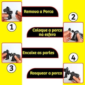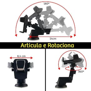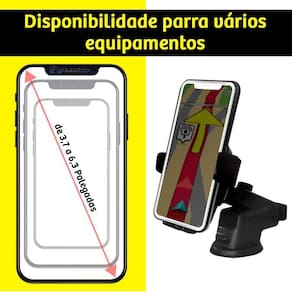 Suporte para Celular Veicular. Esse suporte para celular foi desenvolvido para ser pratico, com máxima segurança e resistência, proporcionando eficiência durante o uso. -compatível com celulares de até 6.3 polegadas, suas alças laterais abrem até 8,4cm e seu braço principal se expande até 14 cm, proporcionando fácil adaptação ao seu dispositivo. -sua fixação é realizada por uma ventosa de silicone altamente aderente, podendo ser fixada no vidro do seu para-brisa ou em seu painel. -rotação de 360 graus, assim obtendo uma boa visualização da tela de seu celular. -designer ergonômico e inovador, garantia de qualidade e proteção de fixação ao suporte.